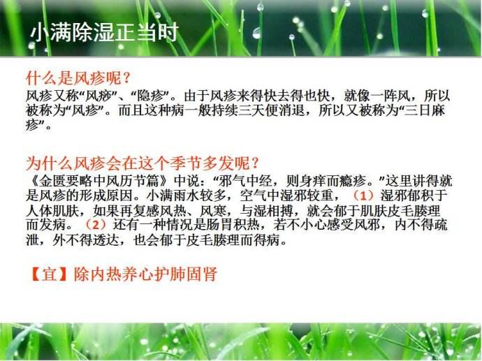 小滿及其后是濕性皮膚病和體濕病的易發期。《金匱要略·中風歷節篇》中記載:邪氣中經,則身癢而癮疹