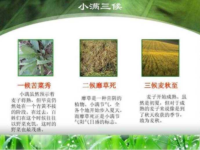 這個時節,中國北方地區夏熟作物籽粒逐漸飽滿,但還沒有成熟,早稻開始結穗,在禾稻上始見一粒粒飽滿的谷實,南方卻已進入夏收夏種季節。
