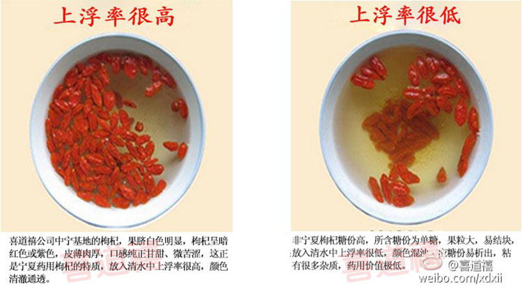 ■泡水:正宗寧夏枸杞含有適度的枸杞多糖,內比重恰到好處。水泡法:將枸杞泡水,看看有沒有下沉,及水色情況;如果發現大量枸杞下沉,則表示不是寧夏枸杞,如果水色變成鮮紅色,則要注意染色和熏制處理,淡黃色表示正常。