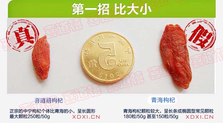 ■大小:通常,寧夏枸杞的顆粒不是很大。如果果粒過大,俗稱“小尖椒”,那就不是寧夏枸杞。一般寧夏枸杞的果粒不是特別的大,寧夏獨有的經緯度、地理、氣候條件、水源及土壤所含有的微量元素等等綜合要素造就了寧夏枸杞獨有的最佳藥用價值,但相對產量較低。這就是為什么正宗寧夏枸杞的價格是一個檔次、正宗寧夏有機枸杞的價格又是另一個檔次!喜道禧枸杞,好枸杞可以貴一點。