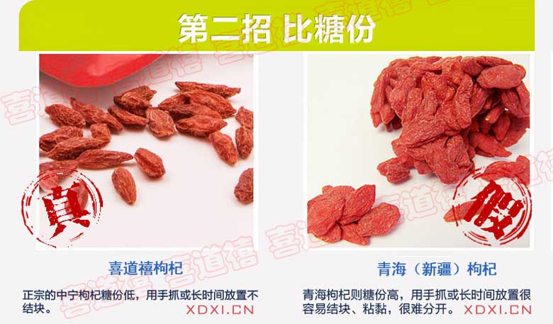 ■手感:正宗寧夏枸杞含有適度的枸杞多糖,掬握一大把干燥的寧夏枸杞干果用力緊攢,然后突然松開手掌,粒粒枸杞跌入盤中叮當脆響,而不會凝結成一個球團;由于寧夏以外的枸杞含有的是普通單糖果糖,新疆、青海的枸杞含糖量太多,用同樣的方法驗證時,會凝結成大的球團。如果是上了色素的劣質枸杞,看上去很紅艷,可用手蘸點口水撫摸一下此枸杞就會掉色。另外,一般情況下正宗寧夏枸杞不易返潮,保質期長一些。